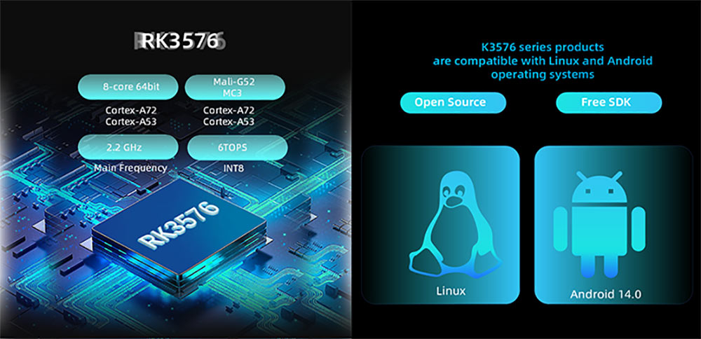 3. 6 TOPD NPU AI Computing Power (Int8/Int16 DECISION) توفر استدلالًا من الذكاء الاصطناعى المسلسل للأجهزة ، وهي قفزة كبيرة على معالجة AI التي تعتمد على وحدة المعالجة المركزية في Raspberry PI 5. هذا يجعل RK3576 مثاليًا لمهام AI Edge مثل التعرف على الصور وتحليل بيانات المستشعر.