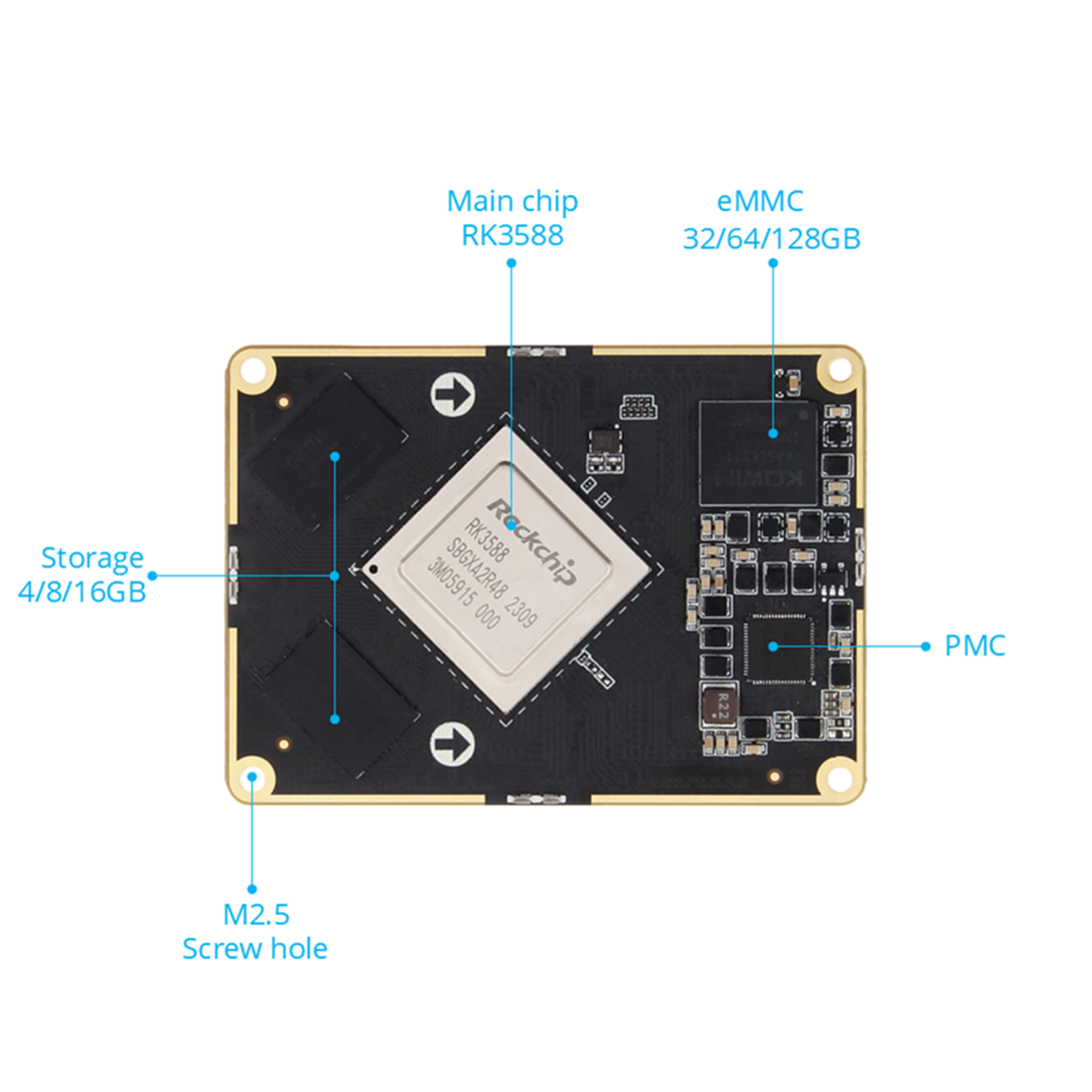 • التكوين الأساسي: ذاكرة الوصول العشوائي LPDDR5 بسعة 16 جيجابايت + eMMC بسعة 128 جيجابايت، ومنافذ جيجابت إيثرنت مزدوجة، ومنفذي USB 2.0، ومنفذي USB 2.1، وستة منافذ MIPI CSI، ومنفذي MIPI DSI، وواجهة Mini-PCle (تدعم بطاقات شبكة Wi-Fi، ووحدات 4G، ووحدات 5G، أو وحدات واجهة Mini-PCle الأخرى)، ومنفذ توسيع 40 سنًا (متوافق مع Raspberry Pi منفذ 40 سنًا، يدعم PWM، GPIO، PCI Express، SPI، UART، وCAN)، M.2 M-KEY متوافق مع محركات أقراص M.2 SSD