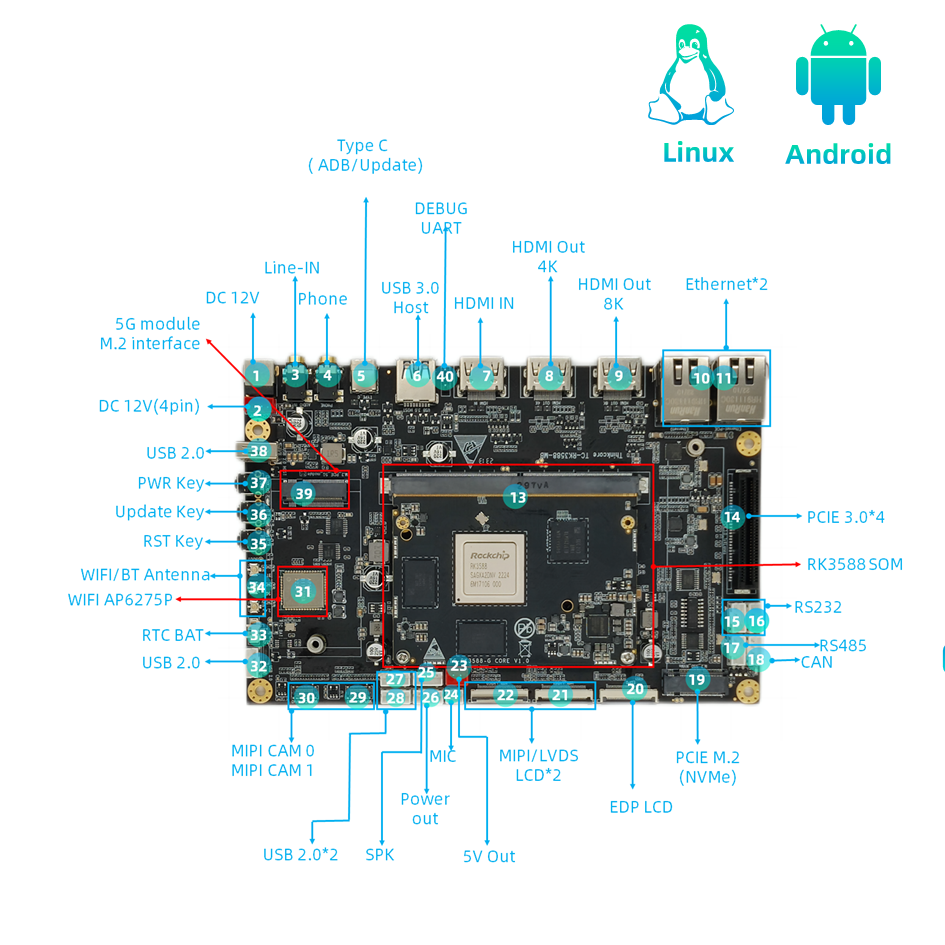 • مزايا RK3588 SBC: بالمقارنة مع منتجات Raspberry Pi، توفر لوحة التطوير RK3588 أداءً فائقًا وواجهات أكثر ثراءً وقدرات معالجة وسائط متعددة أكثر قوة، مما يجعلها أكثر ملاءمة لتطبيقات الذكاء الاصطناعي والتطبيقات الصناعية.